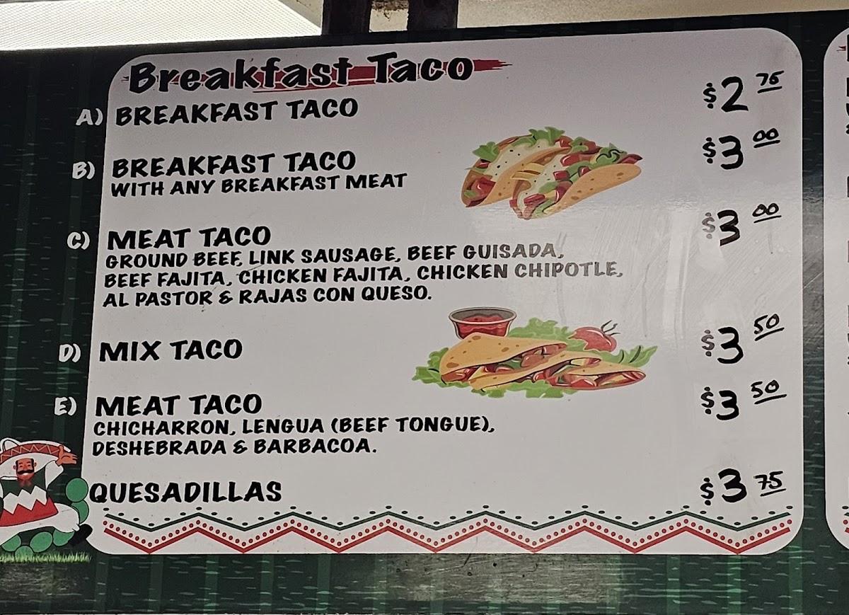 Breakfast tacos feature combinations such as potato and egg, bacon and egg, and chorizo and egg, typically served at affordable prices. The lunch menu expands with a broader selection of tacos using different fillings, including fajita options with beef, chicken, or both, as well as other traditional tacos like lengua and picadillo. Additional sides and accompaniments like cowboy beans and pico de gallo are also part of the offerings.
