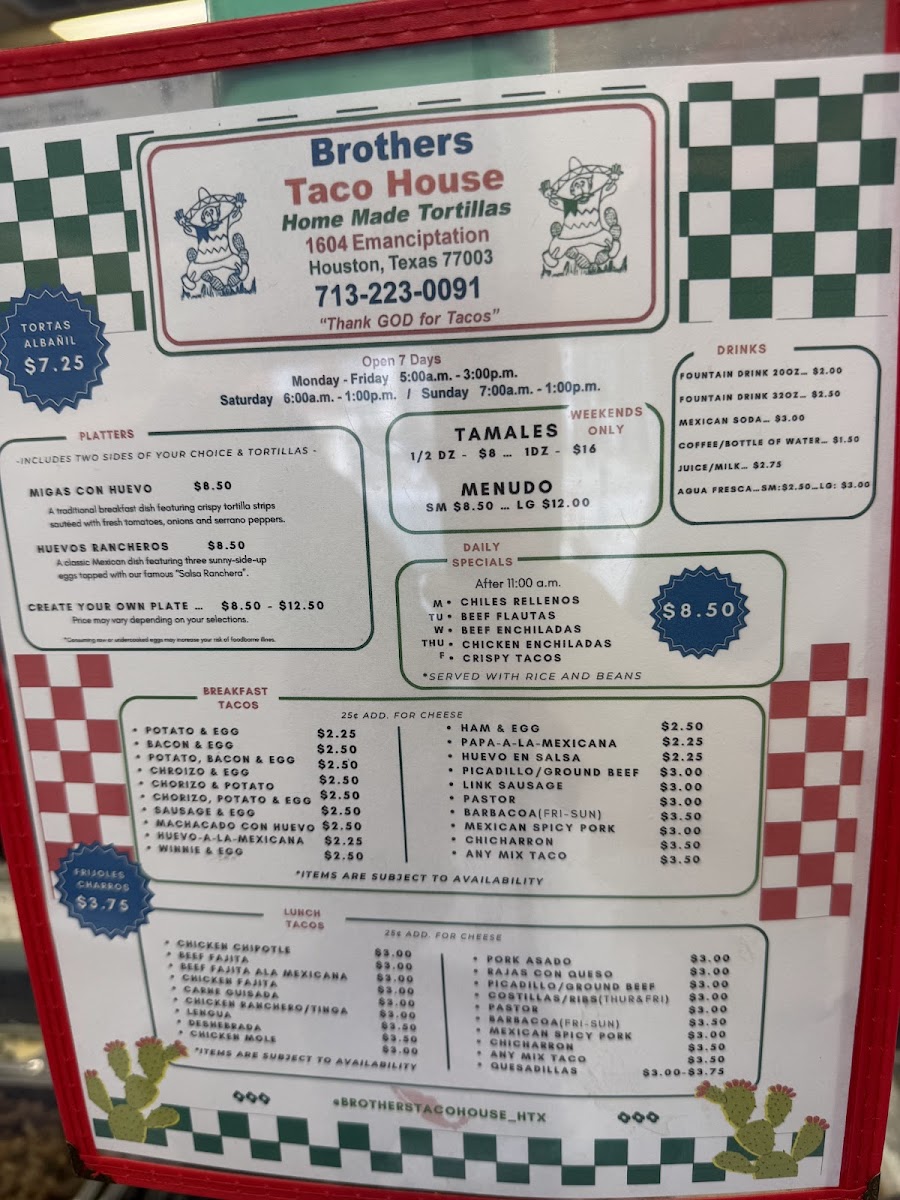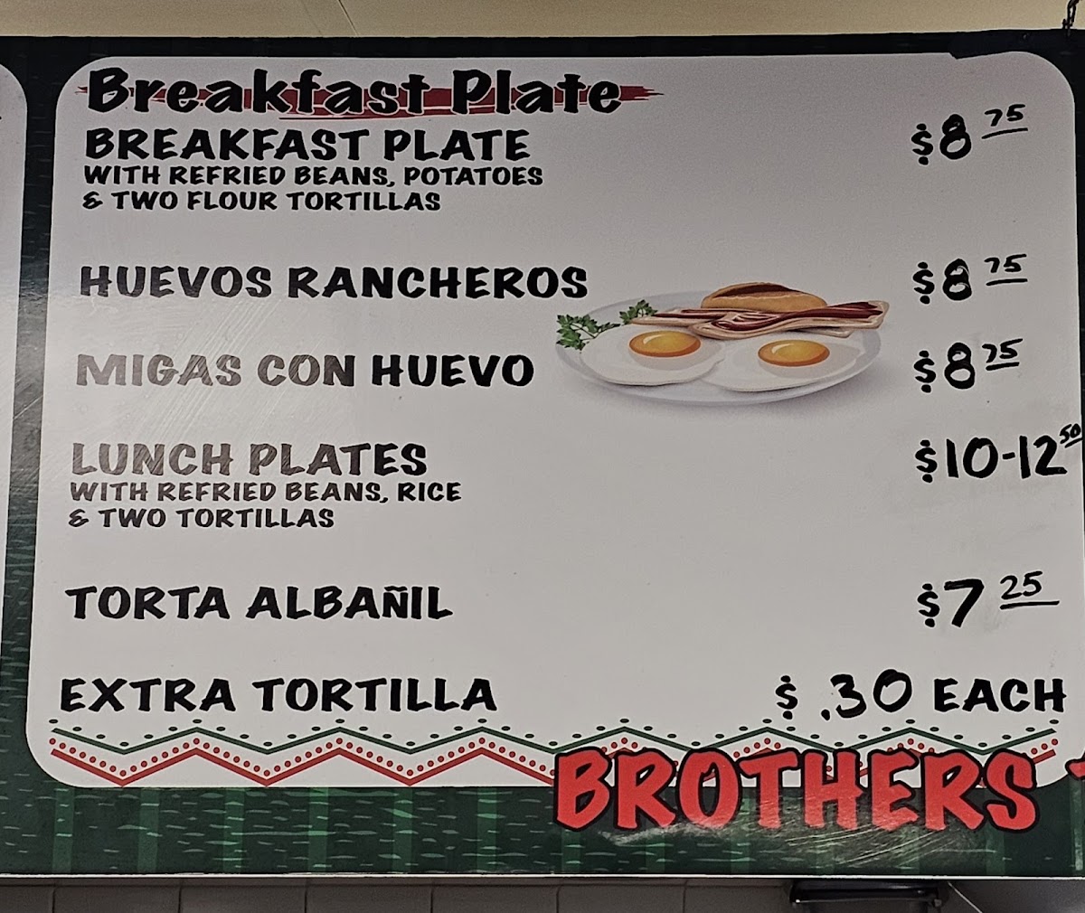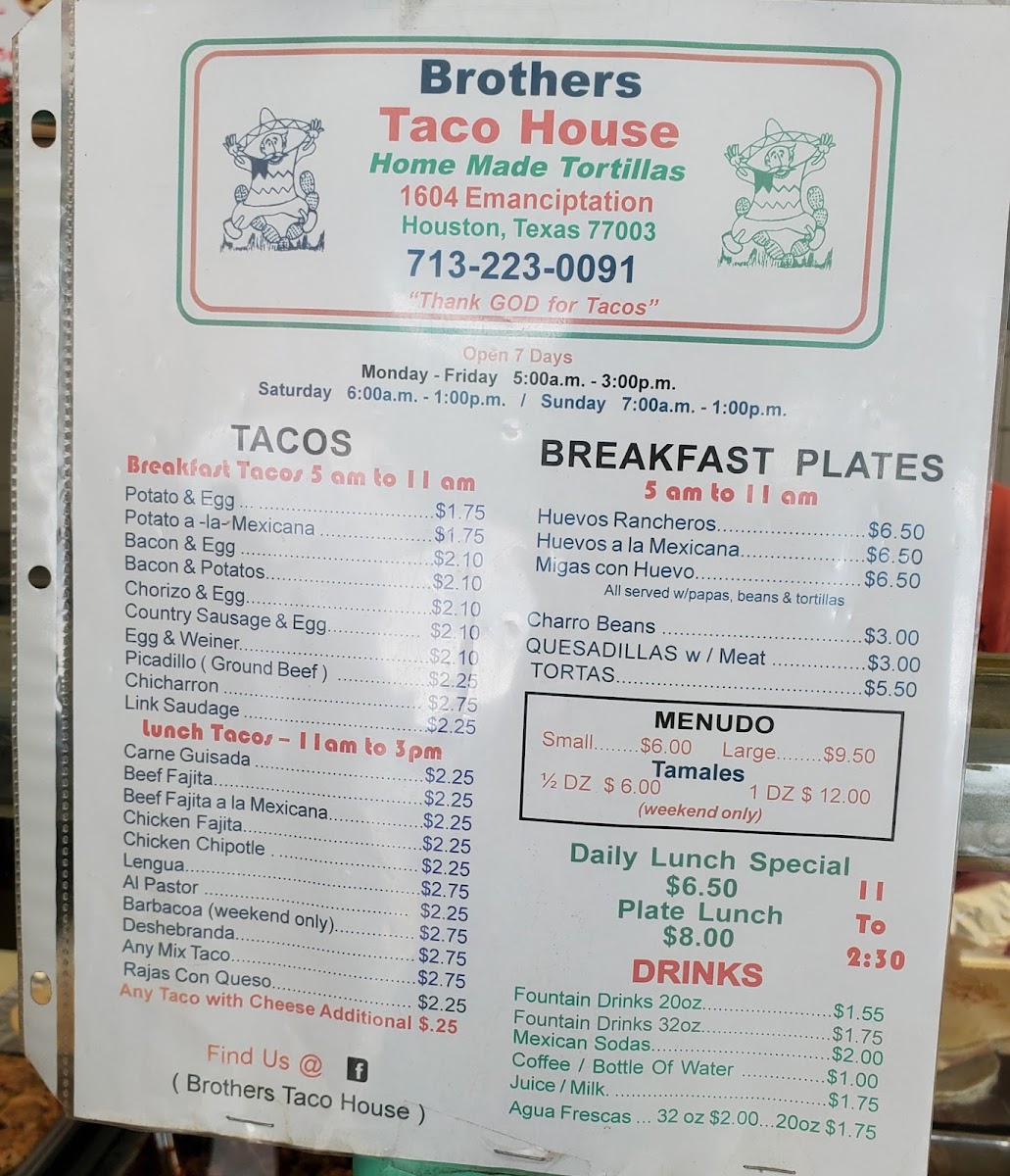 The menu at Brothers Taco House offers a variety of traditional Mexican and Latin American dishes, focusing on tacos and breakfast options. It is organized primarily into categories such as breakfast tacos, lunch tacos, and weekend specials. Visitors will find a range of taco fillings including potato and egg, bacon and egg, chorizo and egg for breakfast, and various meats like ground beef, chicharron, chipotle chicken, carne guisada, fajitas, and barbacoa for lunch. Weekend-only items include barbacoa tacos, pork tamales, and menudo.