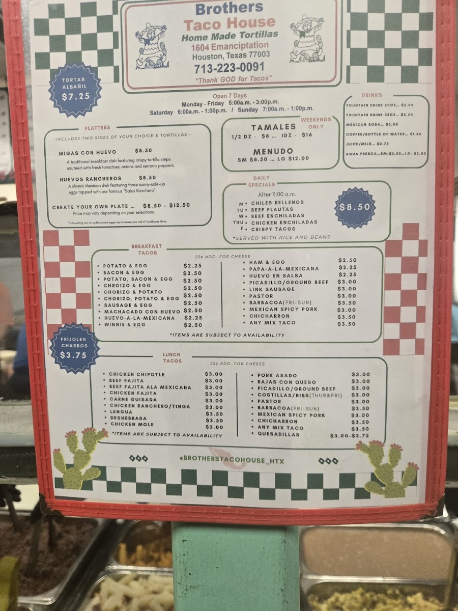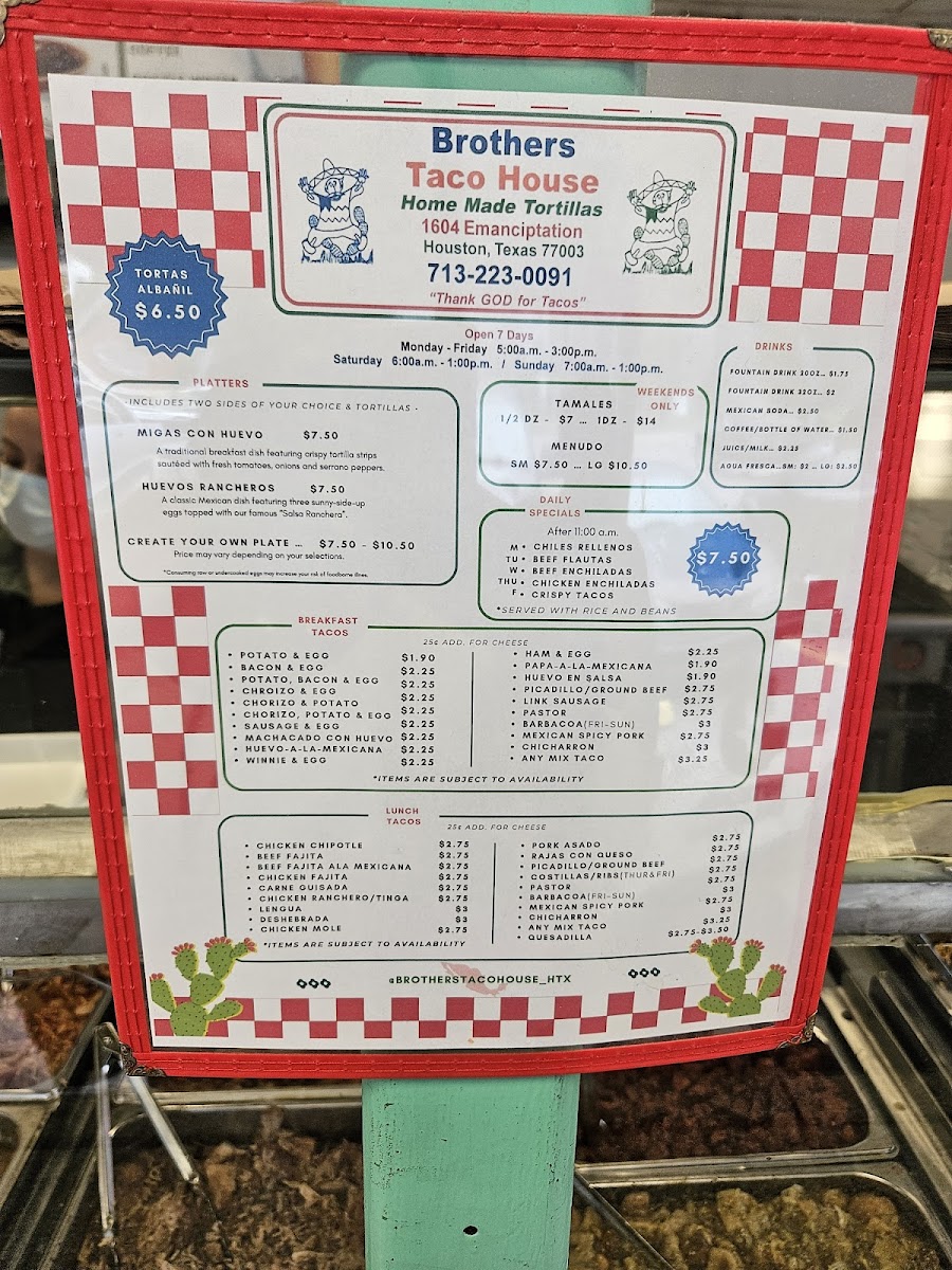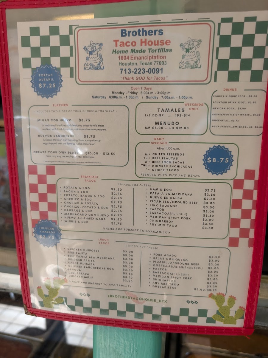 The menu at Brothers Taco House offers a variety of traditional Mexican and Latin American dishes, focusing on tacos and breakfast options. It is organized primarily into categories such as breakfast tacos, lunch tacos, and weekend specials. Visitors will find a range of taco fillings including potato and egg, bacon and egg, chorizo and egg for breakfast, and various meats like ground beef, chicharron, chipotle chicken, carne guisada, fajitas, and barbacoa for lunch. Weekend-only items include barbacoa tacos, pork tamales, and menudo.